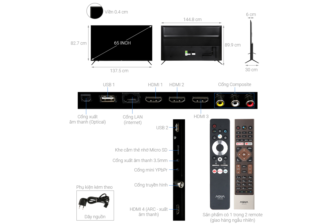 - Android Tivi AQUA có kích cỡ màn hình là 65 inch