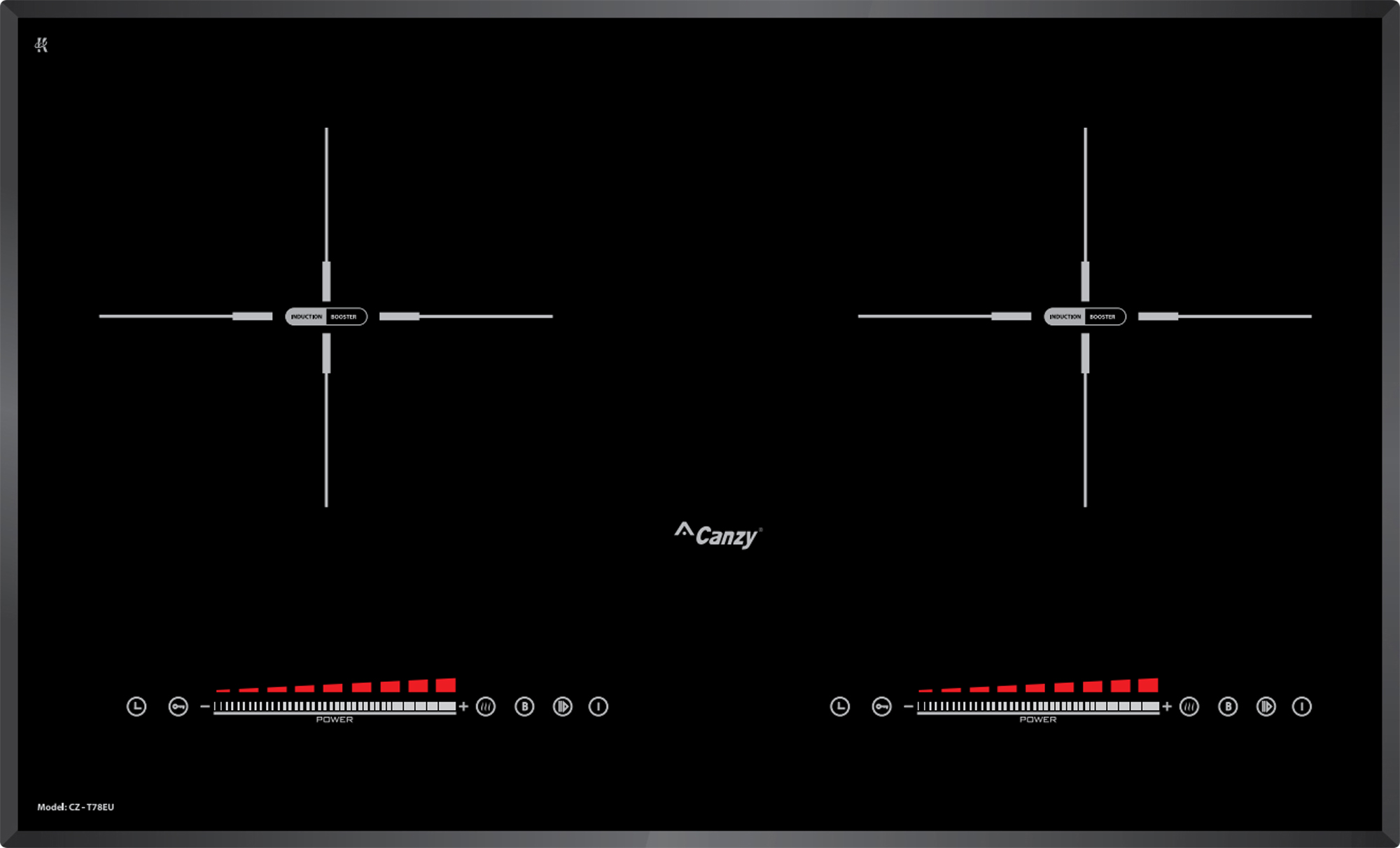 Bếp từ Canzy CZ-T78EU gồm 2 vùng nấu với tổng công suất là 4800W. Vùng nấu trái với công suất là 2000W khi kích hoạt tính năng nấu siêu nhanh Booster công suất lên tới 2400W. Vùng nấu phải với công suất là 2000W khi kích hoạt tính năng nấu siêu nhanh Booster công suất lên tới 2400W. Chỉ trong chốc lát sau khi kích hoạt tính năng này, nhiệt lượng trên vùng nấu từ tăng lên công suất tương đương với mức nhiệt lượng lớn nhất. Do đó, các món ăn được nấu chín nhanh hơn, tiết kiệm thời gian vào bếp cho chị em nội trợ. Chức năng Booster nấu siêu nhanh, tuy nhiên thời gian tối đa mặc định dùng chức năng này là 10 phút / lần tránh quá tải.