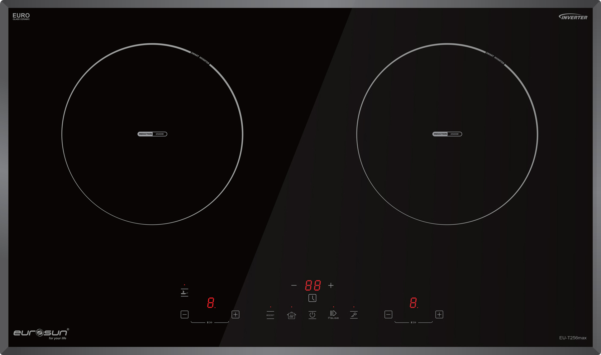 Đây một trong số rất ít bếp từ có thể đạt Booster lên đến 2500W. Với thiết kế của bếp từ Eurosun EU-T256Max vùng nấu trái có khả năng kích công suất Booster cực đại là 2500W giúp công việc đun nấu trở nên nhanh chóng và tiết kiệm thời gian khi cần thiết.