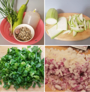 Hành lá, ngò rí bỏ đầu rửa rồi để ráo cắt nhuyễn. Còn hành tím, tỏi lột vỏ băm nhuyễn.