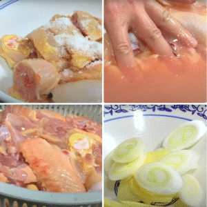 Thịt gà bạn sẽ chặt khúc vừa ăn, sau đó cho vào cái tô lớn, cho thêm khoảng 1/2 muỗng canh muối ăn rồi cho nước vào, dùng tay xoa bóp để nước máu trong thịt gà tiết ra. Cách này sẽ giúp cho nước hầm gà có màu đẹp mắt và không bị tanh.