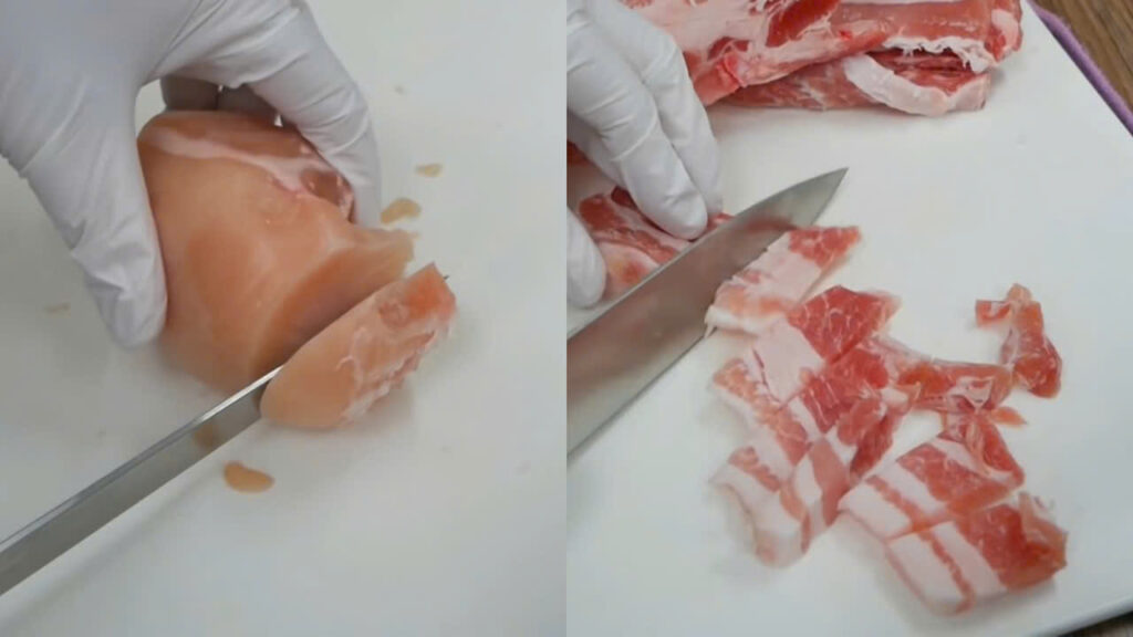 Rửa sạch ức gà và thịt ba rọi, để ráo rồi cắt khúc nhỏ để dễ dàng xay thịt hơn.