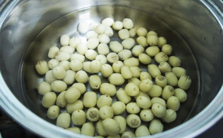 Đối với loại hạt sen khô trong siêu thị: bạn cần ngâm nước tầm 2 tiếng để hạt sen nở đều, không bị cứng.