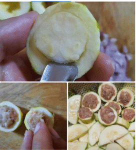 Bạn dùng muỗng cà phê lấy hết ruột trong các đoạn bí ngòi đã cắt khúc lúc nãy, lần lượt lấy ra hết ruột của số bí ngòi.
