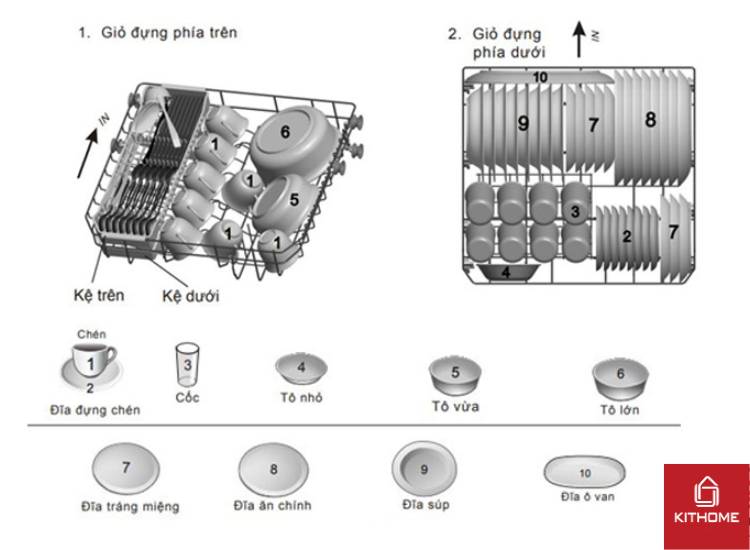 - Sắp xếp bát đĩa đúng vị trí giỏ