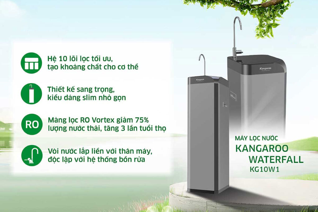 Máy lọc nước Kangaroo 10 lõi KG10W1 thuộc dòng “Waterfall” nổi bật lên như một lựa chọn đáng chú ý, tập trung vào việc cung cấp nguồn nước tinh khiết đạt chuẩn thông qua công nghệ RO, kết hợp với thiết kế tủ đứng hiện đại và thẩm mỹ.