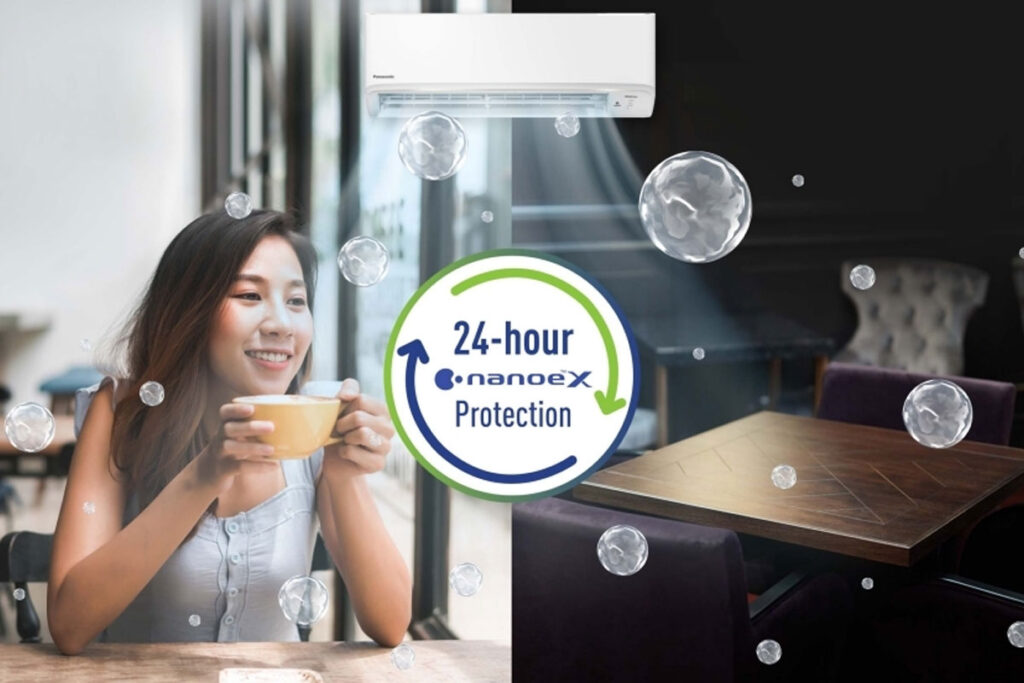 Hơn nữa, bộ phát nanoe™ X có thể hoạt động 24/7$ ngay cả khi không bật chế độ làm lạnh thông qua ứng dụng Panasonic Comfort Cloud với mức tiêu thụ năng lượng thấp 25 W/giờ giúp lọc sạch không gian liên tục, mang lại môi trường sạch sẽ và thoải mái hơn cho bạn, khách hàng, nhân viên suốt cả ngày.