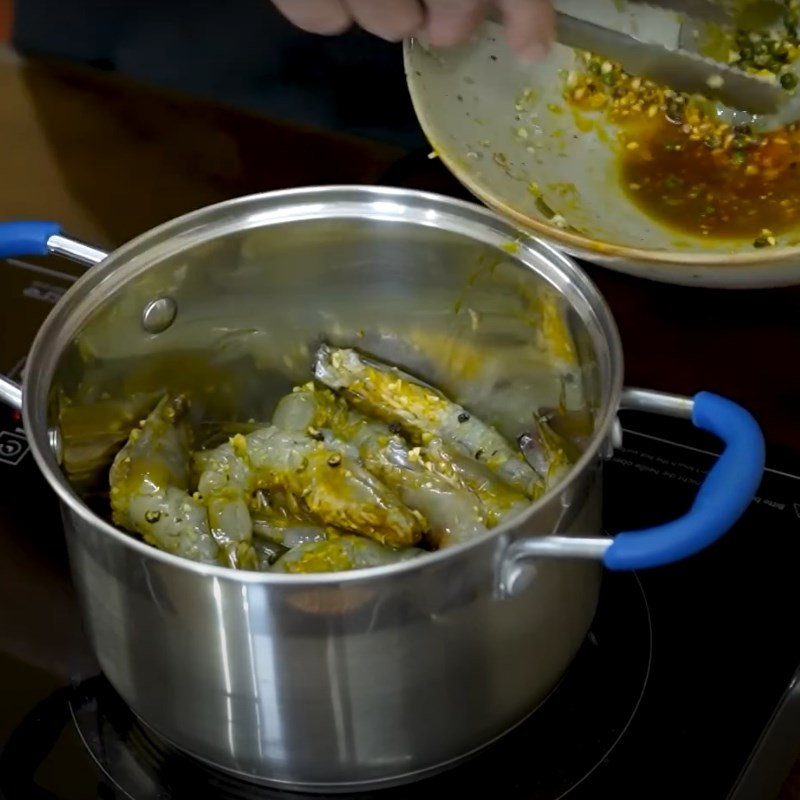 Bắc nồi lên bếp, bạn xếp tôm vào nồi rồi cho nước rim vào, bật lửa lớn để đun sôi. Khi nước sôi rồi thì bạn đậy nắp, hạ nhỏ lửa kho liu riu cho đến khi nước cạn.