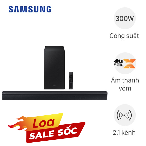 Loa sở hữu hệ thống âm thanh 2.1 kênh tổng công suất 300W (loa thanh 80W, loa sub 220W), tái tạo âm thanh mạnh mẽ, cuốn hút. Công nghệ DTS Virtual:X mang đến âm thanh vòm sống động, mở rộng không gian nghe, tạo cảm giác như ở rạp chiếu phim.