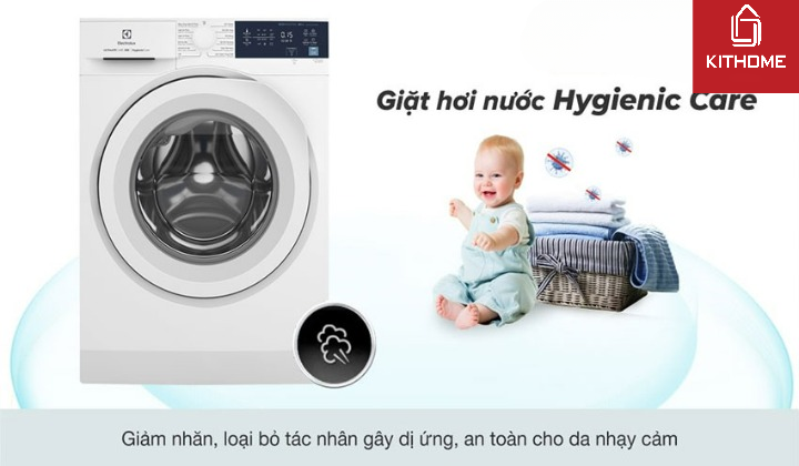 Máy giặt Electrolux lồng ngang EWF1024D3WB này được trang bị công nghệ giặt hơi nước Hygienic Care giúp quần áo được giặt bằng hơi nước ở nhiệt độ cao, khả năng diệt khuẩn lên đến 99,9% góp phần đẩy lùi vi khuẩn và tác nhân gây dị ứng như mạt bụi, phấn hoa, lông mèo có trên quần áo.