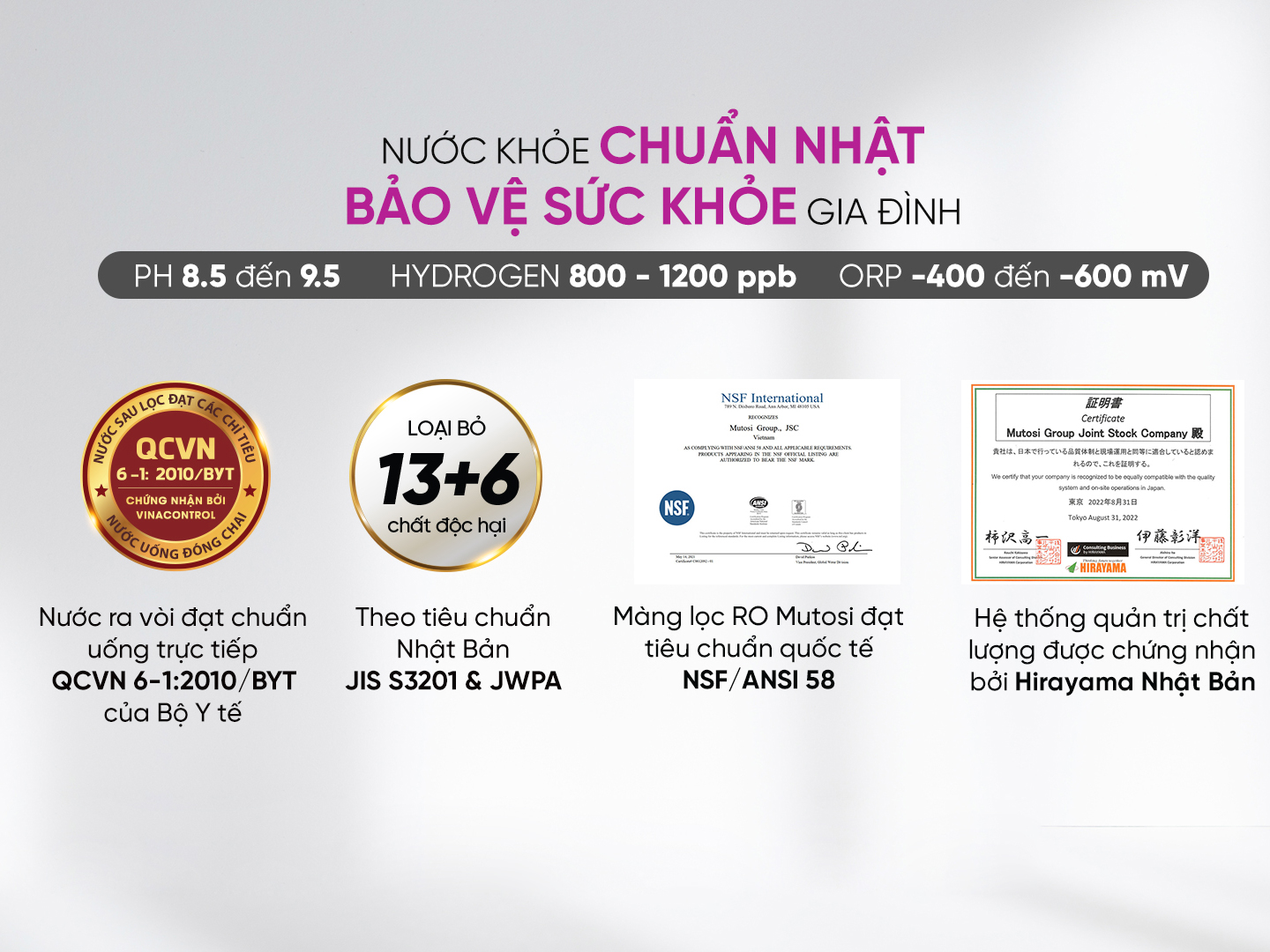 Đặc biệt, lõi ion kiềm Hydrogen tạo ra nguồn nước ion kiềm Hydrogen với chỉ số cao và ổn định, mang lại nhiều lợi ích cho sức khỏe người tiêu dùng. Nước sau khi lọc đã loại bỏ hơn 19 chất độc hại theo tiêu chuẩn JIS S3201 & JWPA của Nhật Bản và đáp ứng các tiêu chí QCVN 6-1/2010 BYT về nước uống trực tiếp, được chứng nhận bởi Vinacontrol.