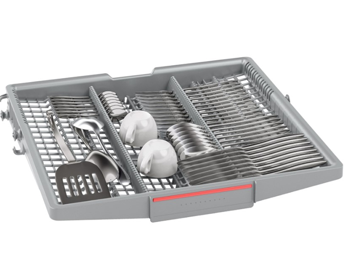 VarioFlex của máy rửa bát Bosch series 4 SMS4EMI01E linh hoạt và sử dụng không gian tốt hơn. Thiết kế giàn VarioFlex của Bosch có giàn thứ 3 riêng biệt để xếp dao, kéo, thìa hay dia của bạn một cách khoa học. Thiết kế mặt bên của giàn có thể hạ thấp được xuống để xếp cốc nhỏ, bát nhỏ. Các điểm tiếp xúc màu đỏ và các nút màu đỏ đánh dấu vị trí và cách điều chỉnh giàn linh hoạt với dao kéo được xếp. Với thiết kế như thế, nội thất của máy rửa bát trở nên khoa học và gọn gàng hơn.