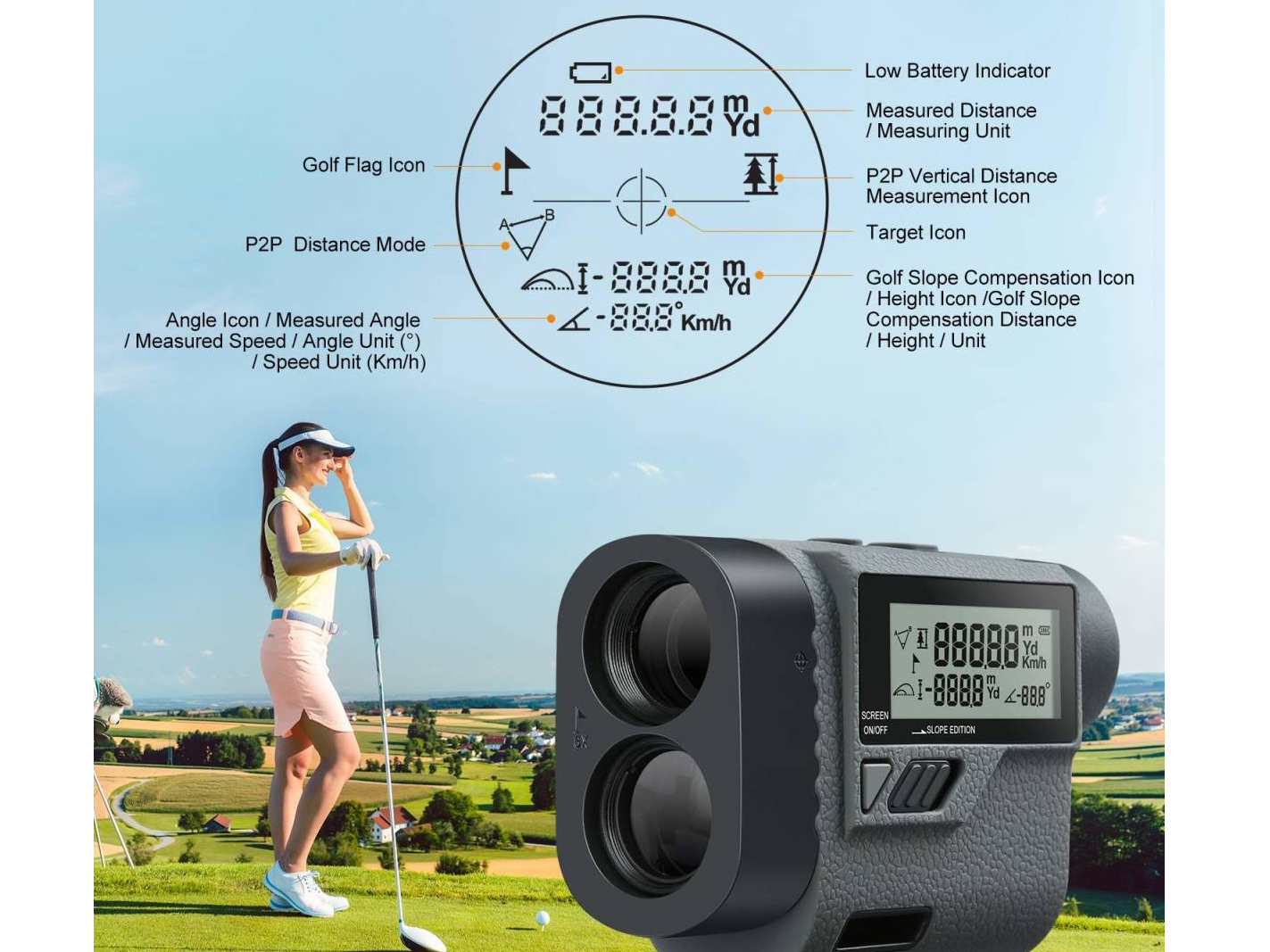 Ngoài chức năng đo khoảng cách thông thường, ống nhòm chơi golf Huepar HLR1000 còn hỗ đo xác định khoảng cách sử dụng trong sân golf với chế độ đo bù trừ độ dốc, nghiêng – chế độ slope, chế độ đo và xác định nhanh khoảng cách đến lá cờ trong sân golf tương ứng như chế độ trên ống nhòm Bushnell.