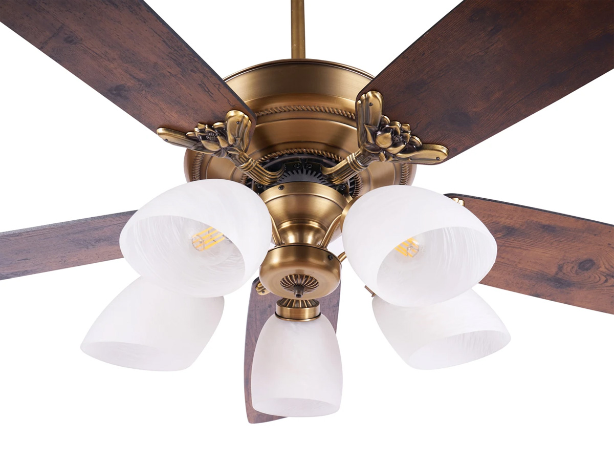 Sản phẩm được sơn phủ màu vàng đồng quý phái, mang phong cách hoàng gia phù hợp với nội thất Việt Nam. Từng chi tiết từ thân quạt, ốp, khung đèn đến cánh quạt đều được gia công tỉ mỉ, chống trầy xước và gỉ sét trong quá trình sử dụng, đảm bảo vẻ đẹp lâu dài.