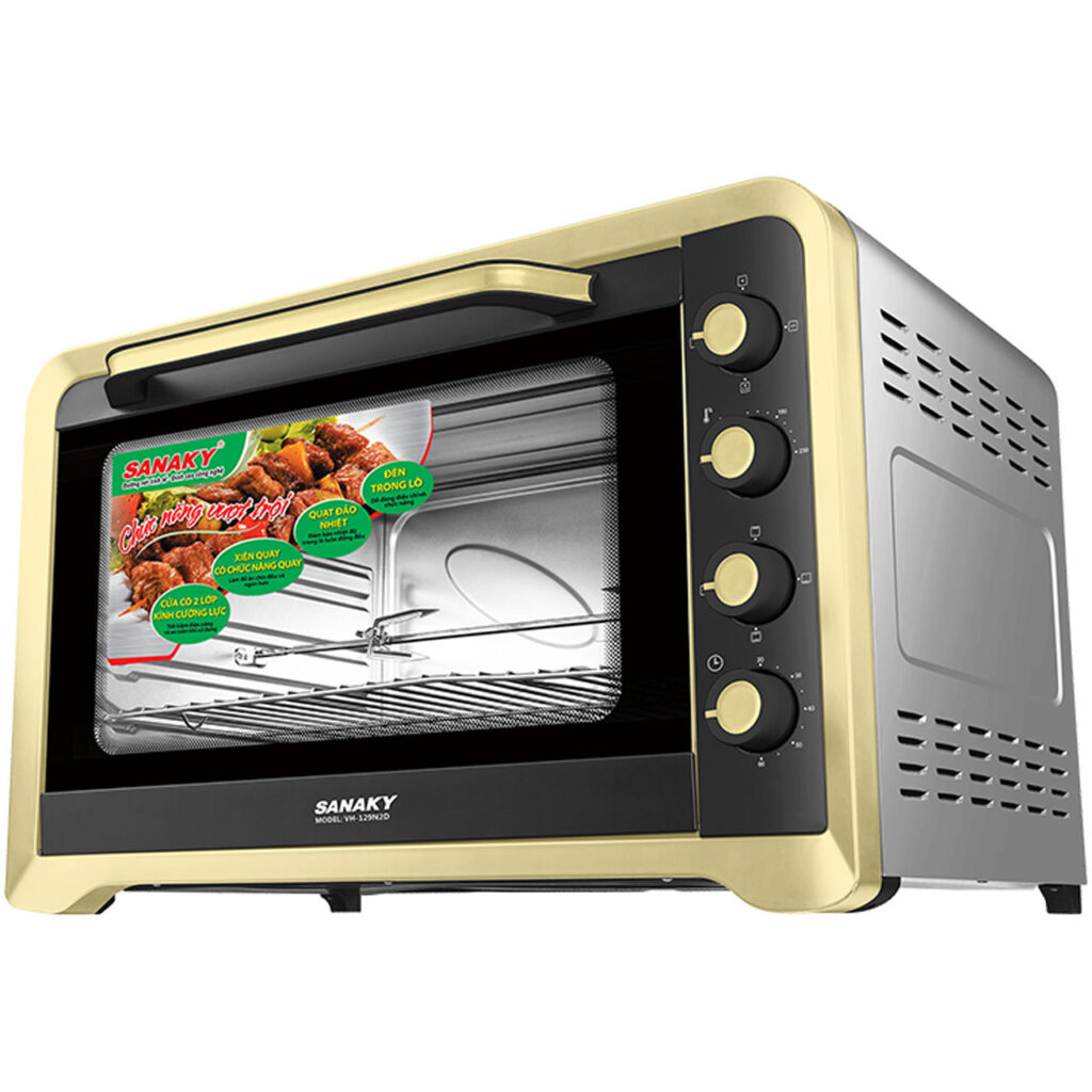 Lò nướng Sanaky 120 lít VH-129N2D dung tích 120 lít (màu vàng) có thiết kế hiện đại và sang trọng, phù hợp với nhu cầu sử dụng trong gia đình có nhiều người, quán ăn hay nhà hàng. Với dung tích 120 lít VH 129N2D có thể nướng gà nguyên con, nướng bánh, thịt bò, heo….. Đây là lò nướng Sanaky điện đầu tiên sử dụng cửa kính cường lực 2 lớp màu đen có khả năng giữ nhiệt tốt và bền.