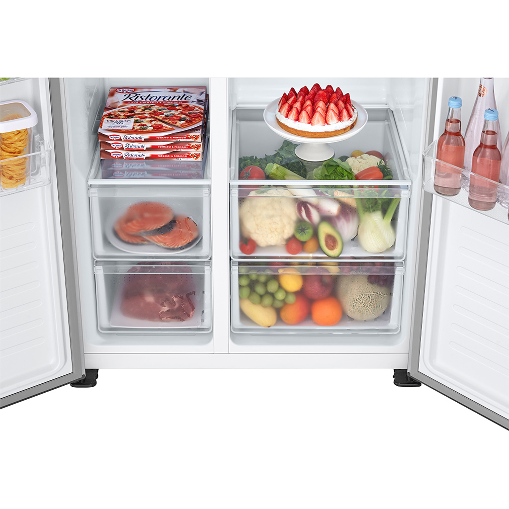 Tủ Lạnh LG Inverter Side By Side 519 Lít GR-B256JDS là sản phẩm tủ lạnh Side by Side hiện đại mới được LG ra mắt vào năm 2023 nhưng đã nhanh chóng trở thành sản phẩm yêu thích của nhiều người tiêu dùng. Với thiết kế hiện đại, sang trọng, công nghệ làm lạnh tiên tiến cùng nhiều tiện ích thông minh và khả năng tiết kiệm điện hiệu quả, thiết bị sẽ giúp bạn lưu trữ nhiều loại thực phẩm khác nhau một cách lâu dài. Đặc biệt, dung tích 519 lít sẽ phù hợp để bảo quản lượng thực phẩm lớn cho các gia đình có từ 4 – 5 người hoặc có nhu cầu bảo quản thực phẩm cao.