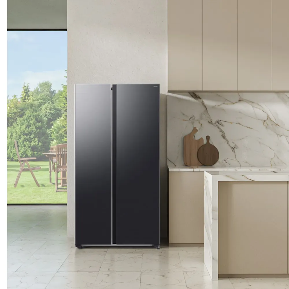 Với kiểu dáng Side-by-Side hiện đại cùng gam màu tinh tế, chiếc tủ lạnh này không chỉ đáp ứng tốt nhu cầu lưu trữ thực phẩm mà còn góp phần tăng tính thẩm mỹ cho không gian bếp. Bên trong tủ là không gian rộng rãi với hệ thống khay kệ và ngăn chứa được bố trí khoa học, giúp người dùng dễ dàng sắp xếp và bảo quản nhiều loại thực phẩm khác nhau.