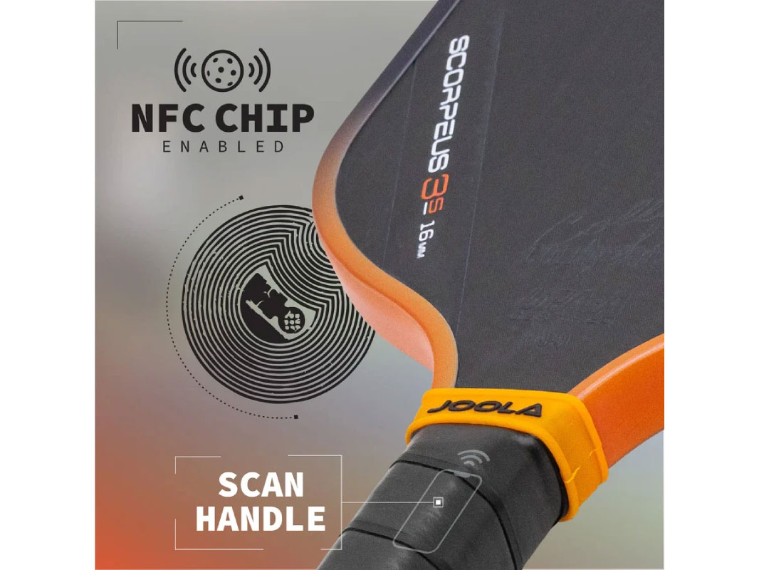Vợt Pickleball Joola Collin Johns Scorpeus 3S 16mm được trang bị chipset NFC trên tay cầm giúp xác thực thông minh cho người dùng. Chỉ cần chạm điện thoại vào vợt, bạn sẽ ngay lập tức truy cập vào ứng dụng JOOLA CONNECT, nơi cung cấp nhiều tính năng đặc biệt và thông tin chi tiết về sản phẩm.