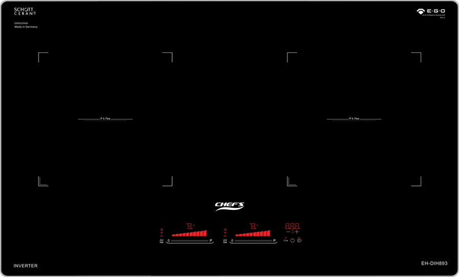 EH-DIH893 vẫn sử dụng mặt kính Schott Ceran giống như những mẫu bếp từ cao cấp nhập khẩu từ Đức hoặc Tây Ban Nha. Tương tự như Cata, các sản phẩm dòng bếp cao cấp của Chefs đều có mã số riêng trên mặt kính sau chương trình ký kết hợp tác với công ty Schott – Đức.