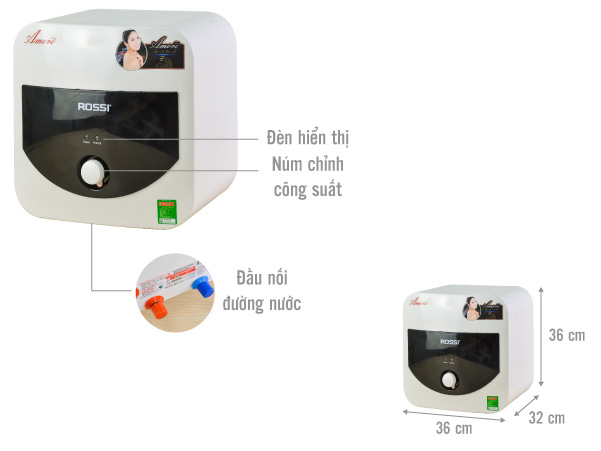 Bình nóng lạnh Rossi Amore RAM-15SQ 15 lít có kiểu dáng hiện đại theo phong cách Italy sang trọng. Dung tích lưu trữ lượng nước nóng là 15 lít. Bình nước nóng Rossi Amore sử dụng công suất lớn, làm nóng gián tiếp với đường nước vào và ra riêng biệt, có thể sử dụng nhiều lần sau 1 lần làm nóng, giúp tiết kiệm điện năng.