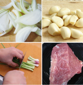 Hành tây bóc vỏ, rửa sạch rồi cắt múi cau. Tỏi bóc vỏ và rửa sạch.