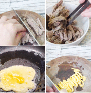 Bước 4 Cắt thịt bò và chiên trứng Canh bánh gạo tteokbokki (tteokguk) -
