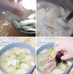 Cuối cùng là múc canh bánh gạo ra tô, rắc lá hành cắt nhỏ, xếp 1 vài lát thịt bò, trứng và rong biển khô cắt sợi, vài lát ớt đỏ và chút tiêu xay là có thể thưởng thức ngay rồi.