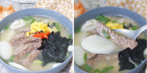 - Người Hàn thường ăn tteokguk với trứng chiên thái mỏng, thịt, rong biển, hành lá,… vào ngày đầu năm mới vì món ăn này được cho là sẽ mang lại nhiều may mắn và phước lành.