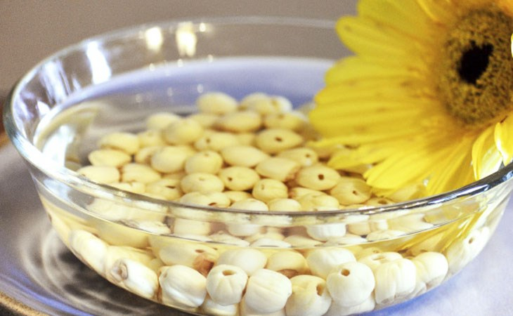 Đối với loại hạt sen khô trong siêu thị: bạn cần ngâm nước tầm 2 tiếng để hạt sen nở đều, không bị cứng.