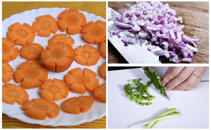 Cà rốt gọt vỏ, tỉa hoa. Hành tím băm nhuyễn. Hành lá cắt nhỏ.
