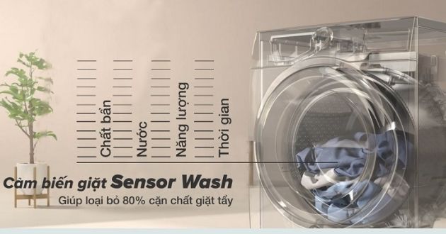Cảm biến SensorWash là sự kết hợp giữa cảm biến trước giặt (Turbidity) và cảm biến sau giặt (Conductivity) để nâng cao hiệu quả giặt sạch và giảm cặn bột giặt hiệu quả. Trước giặt, cảm biến SensorWash sẽ làm nhiệm vụ đánh giá mức độ bẩn của quần áo, sau đó sẽ điều chỉnh thời gian giặt cho phù hợp. Sau giặt, máy sẽ cảm biến lượng bột giặt còn bám lại để đưa ra số lần xả sao cho sạch hoàn toàn.