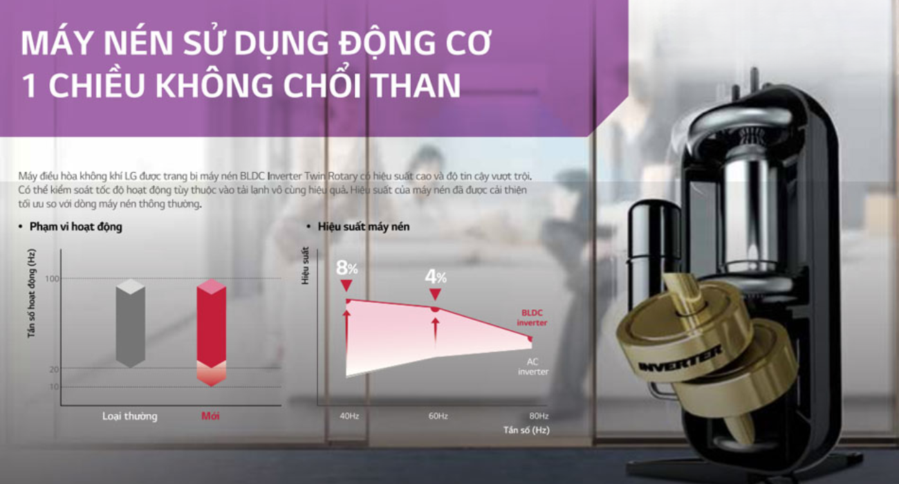 Dàn nóng Multi LG A2UQ18GFD0 được trang máy nén BLCD Inverter Twin Rotary có hiệu suất cao và độ tin cậy vượt trội. Có thể kiểm soát tốc độ hoạt động tùy thuộc vào tải lạnh vô cùng hiệu quả. Hiệu suất của máy nén cũng được cải thiện tối ưu so với dòng máy nén thông thường.