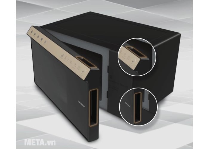 2 kiểu tay cẩm dễ dàng đóng và mở, tay cầm ẩn phía trên và bên phải lò vi sóng Sharp giúp bạn dễ dàng đóng và mở cửa lò ở hai hướng khác nhau.