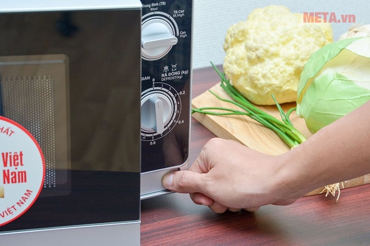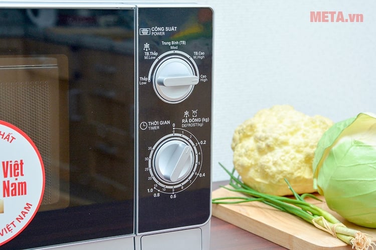 Bên cạnh đó, sản phẩm lò vi sóng này còn được trang bị bảng điều khiển cơ, có ghi chú chức năng bằng tiếng Việt vô cùng trực quan, chi tiết để người dùng dễ dàng sử dụng. Núm vặn bên trên dùng để tùy chỉnh công suất còn núm vặn bên dưới giúp chỉnh thời gian hoặc trọng lượng thực phẩm.