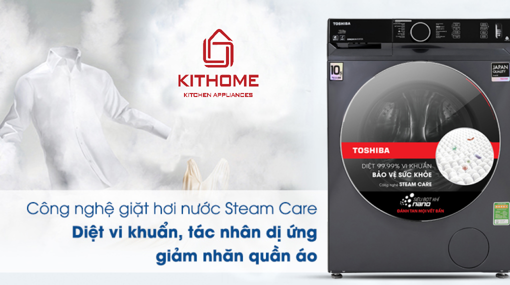 Máy giặt Toshiba inverter TW-BK105G4V(MG) được tích hợp công nghệ giặt hơi nước gúp ngăn chặn lây lan côn trùng siêu nhỏ. Hơn nữa hơi nước nóng đến 80 – 90 độ C bay lên trong lồng giặt sẽ giúp giảm mùi bám trên quần áo, các sợi vải được bảo vệ và ít nhăn hơn.