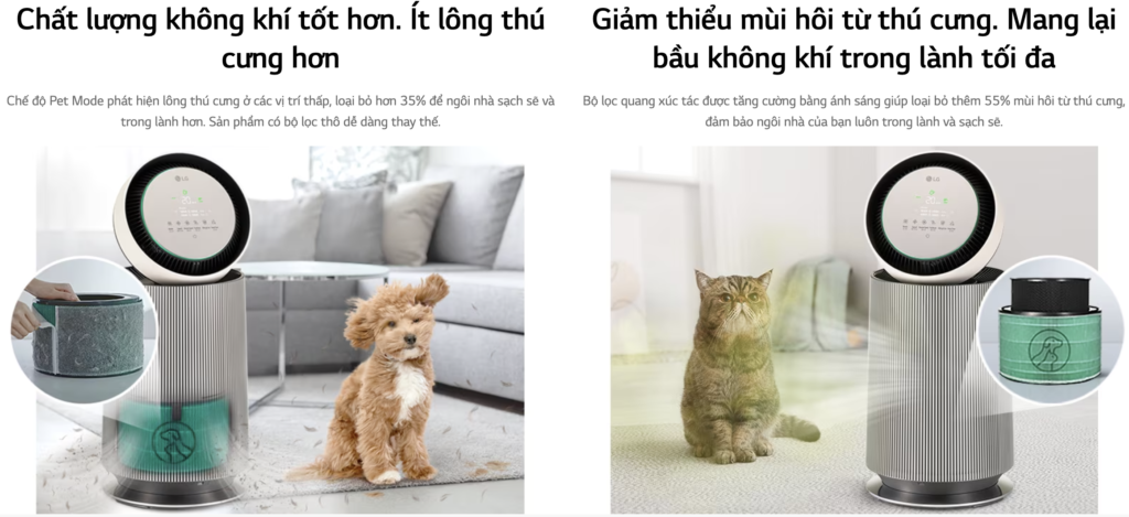 Chế độ lọc chuyên biệt cho thú cưng: Một tính năng độc đáo khác của máy lọc không khí gia đình LG AS10GDBY0 là chế độ lọc chuyên biệt dành cho thú cưng. Chế độ này có khả năng loại bỏ hiệu quả lông thú, mùi hôi và các hạt bụi nhỏ từ vật nuôi, giúp không gian sống luôn trong lành và thoải mái. Điều này đặc biệt hữu ích cho các gia đình nuôi thú cưng, giúp giảm bớt các vấn đề về dị ứng và giữ cho môi trường sống luôn sạch sẽ.