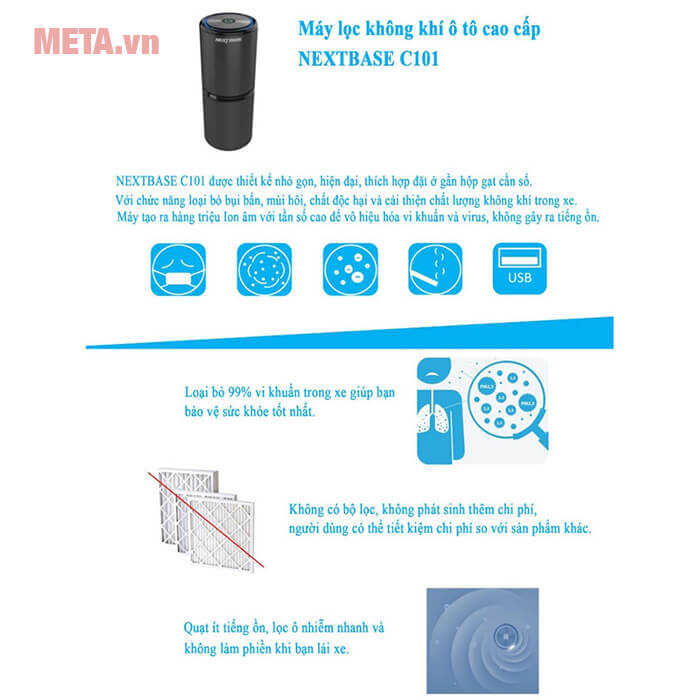 Máy lọc không khí ô tô Nextbase CAP-C101 có khả năng loại bỏ đến 99% bụi mịn PM 2.5 trong không khí trong xe.Máy lọc không khí ô tô Nextbase CAP-C101 không sử dụng bộ lọc, không tốn chi phí vận hành, giúp người dùng tiết kiệm chi phí hơn hẳn so với những thiết bị lọc không khí sử dụng bộ lọc khác.