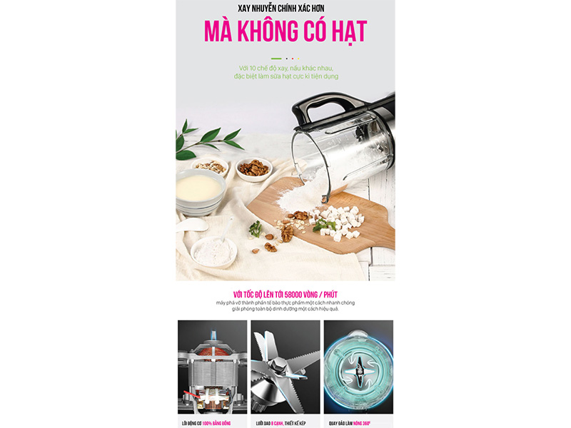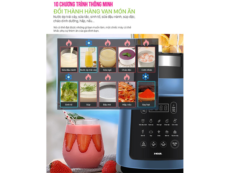 Máy trang bị 10 chức năng xay nấu được thiết lập sẵn như làm sữa đậu nành, nước ép trái cây, sữa ngô, cháo đặc, cơm nhão, sinh tố, súp, đậu mè, hấp và nấu, xay hạt để đáp ứng nhu cầu đa dạng của người dùng.