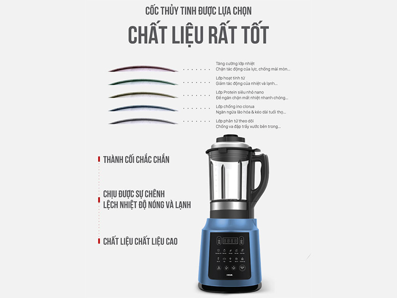Cối xay được làm từ thủy tinh dày 5 lớp có thể chịu nhiệt lên tới 300 độ C cùng mâm nhiệt phủ chống dính Ceramic cao cấp giúp dễ dàng vệ sinh.