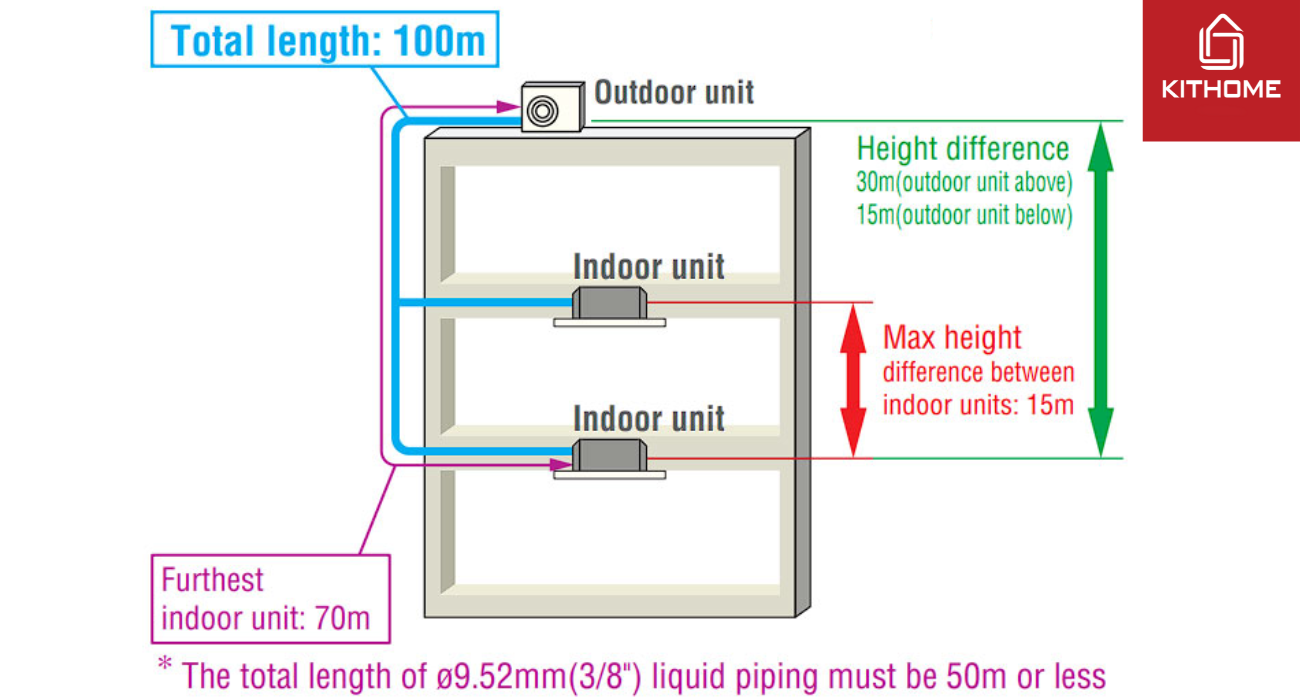 Chiều dài đường ống của dàn nóng điều hoà Mitsubishi Heavy KXZ FDC900KXZE1 đã được mở rộng chênh lệch chiều cao tối đa giữa các lạnh lên đến 18m và cho phép lắp dàn lạnh trên 3 tầng. Dàn lạnh xa nhất 160m hoặc tổng chiều dài có thể dài tới 1000m góp phần tăng tính linh hoạt trong thiết kế hệ thống.
