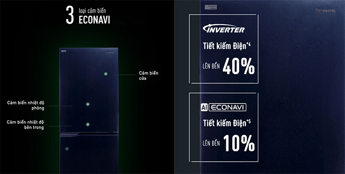 Ngoài ra, tủ được trang bị 3 loại cảm biến ECONAVI. Nhằm theo dõi việc sử dụng tủ lạnh hàng ngày và ghi lại các hoạt động như thời gian sử dụng tủ lạnh nhiều nhất và tần suất sử dụng tủ lạnh, trong 3 tuần.